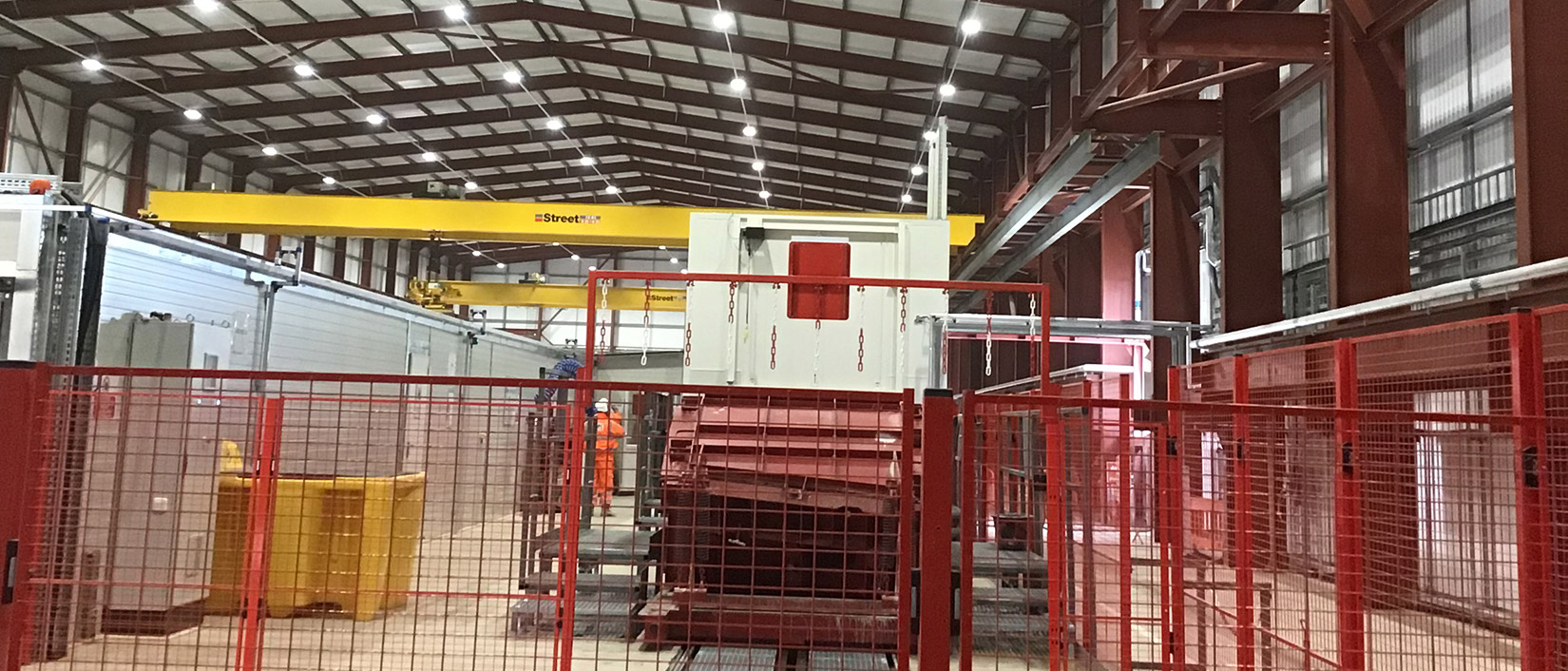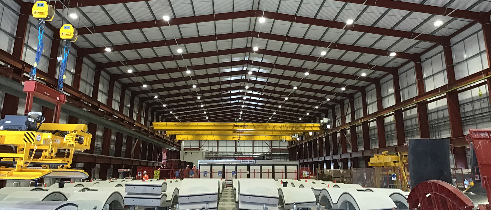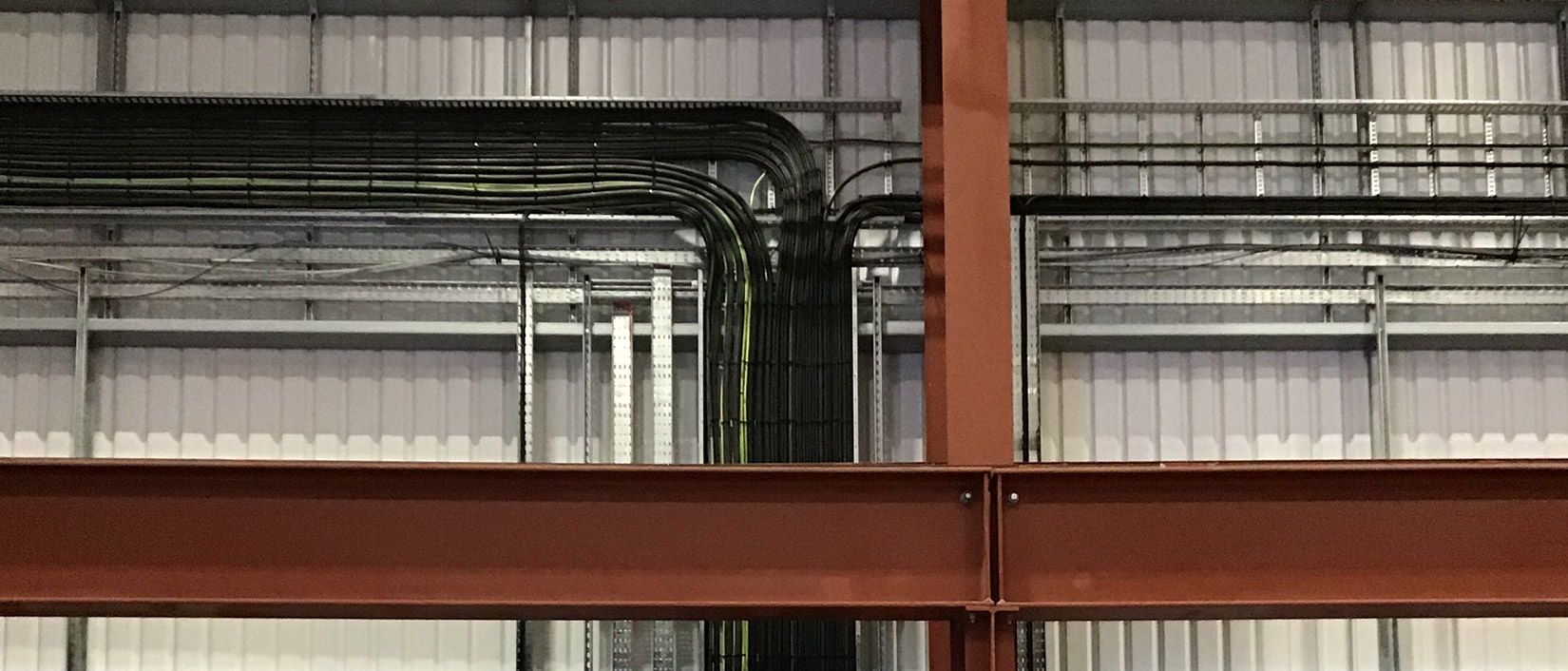 Electrically the building has its own diverse HV package substations and main LV distribution panels high level perimeter ladder rack containment distributes sub-main cabling to local distribution boards. High-level Tecton LED lighting system illuminates the main production area, with emergency lighting central battery system providing safety lighting in the event of a power outage.