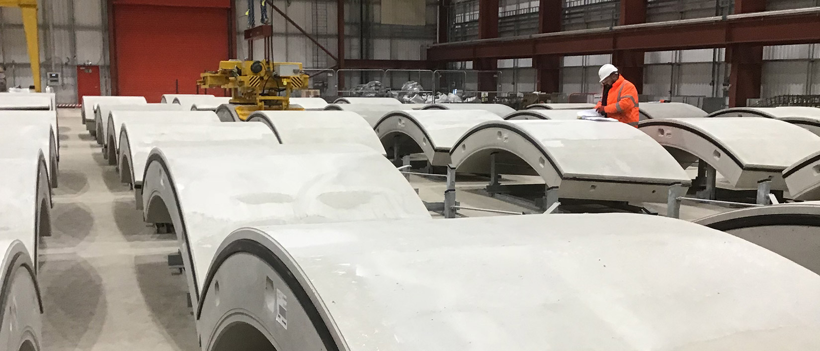 A purpose-built facility to manufacture concrete ring segments that will form the main cooling tunnels for the new Hinkley Point C nuclear power station in Bridgwater. When operational the facility can produce 160 segments a day and will run 24/7. Each segment measures 6m x 4m and weighs several tonnes. A total of 48,000 segments are needed to build the new cooling tunnels that run out into the Severn Estuary. It is understood the facility will go on to produce the tunnel segments for the new HS2 high speed rail link that is underway between London and Birmingham.
