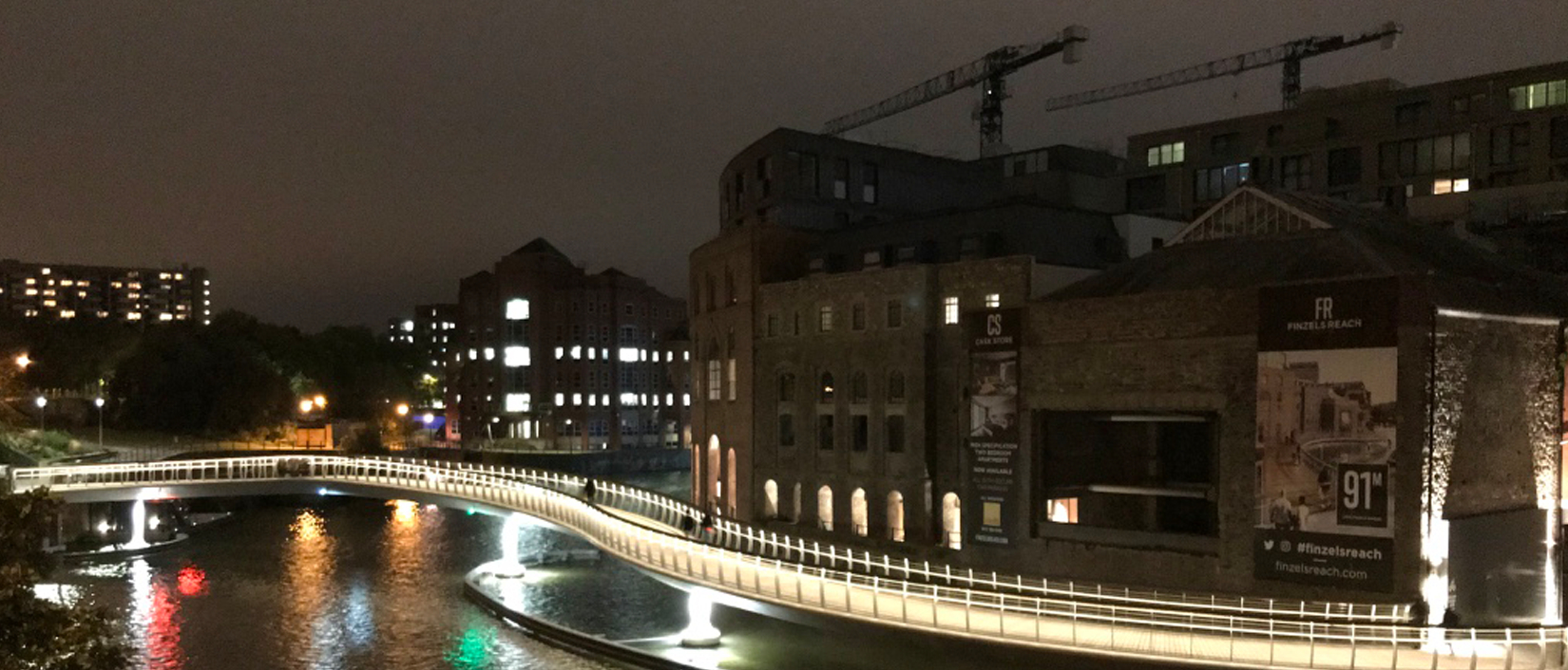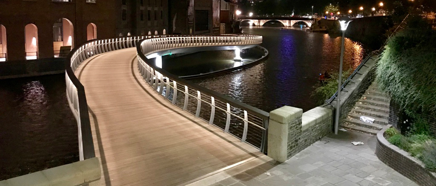 Made from a series of unique curved steel sections topped with timber decking, sculptured cladding and feature lighting, the £2.7million bridge is a striking new landmark in Bristol. Highly efficient LED lighting installed within the hand rail of the bridge illuminates the entire 91m walkway and is fed from a UPS battery backup system to maintain the lighting even in the event of power failure. Additional lighting washes down the structural columns and bridge mounted navigation lights provide guidance for all water-going vessels that pass underneath.